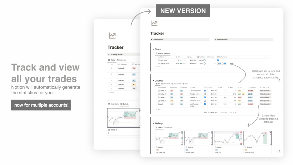 - 📈 Journal (Tracker): The heart of this template is dedicated to record all the trades and the most important insights. Never forget a single detail again. Here you will find organized sections to capture the name of the setup or strategy used, the session you , the date of the trade and the different timeframes. In addition, you will have specially designed cells to attach screenshots of the charts at different times (I also paste the screenshots inside the content to use the gallery view). Document the low timeframe scenario upon detecting the opportunity, record the execution of the trade, and retain the high timeframe scenario for further analysis. Keep a detailed record of each step and improve your decision making. [improved in Suite Pro]