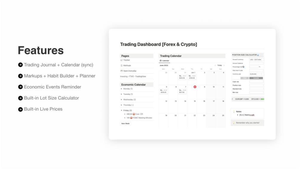 - 🧮 Calculator: Prepare the size of your trade directly without having to leave the Notion template. For EUR/USD, EUR/GBP, USD/CAD, USD/GBP & BTC/USD. [improved in Suite Pro for all financial markets]