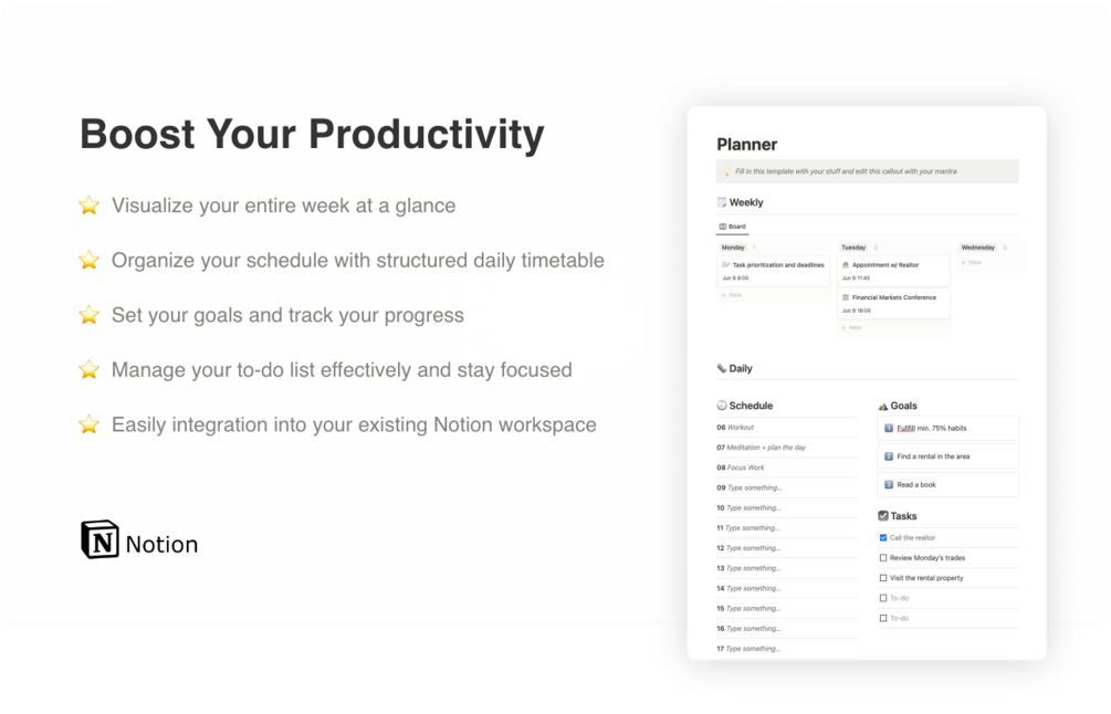 - Seamless integration: Easily integrate the Notion Planner Template into your existing Notion workspace for a streamlined planning experience.